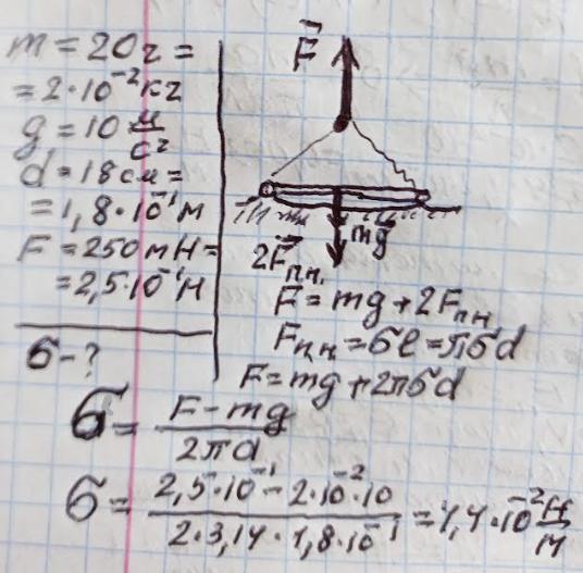 Дротяне кільце масою 20 г і діаметром 18 см відривають за допомогою динамометра від поверхні рідини. Динамометр у момент відриву показує 250 мН. Чому дорівнює поверхневий натяг рідини?