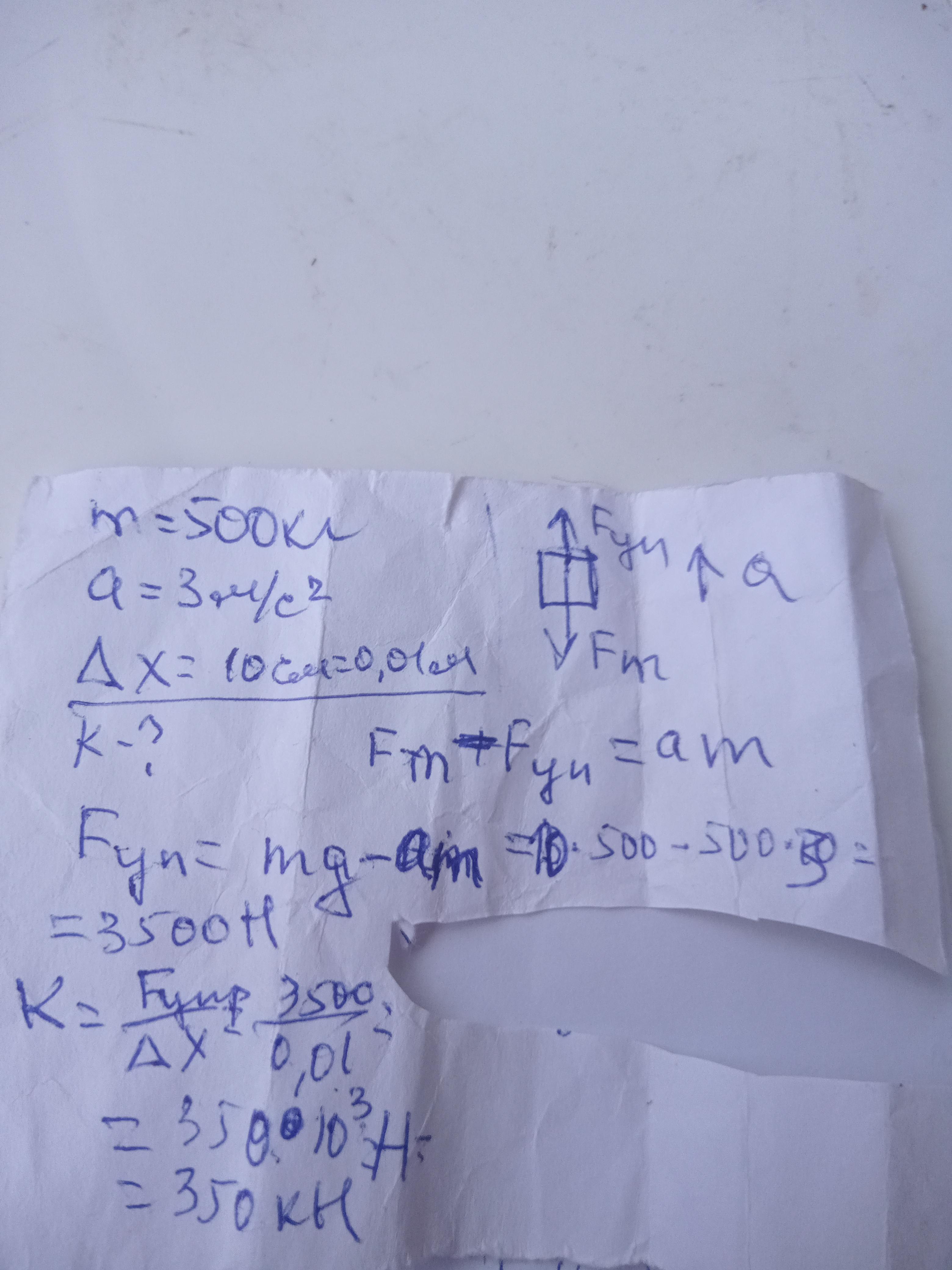 при подъеме груза массой 500 кг с ускорением 3м/с2 трос удоенился на 10 см определите коэфицент упругости помогите умоляю