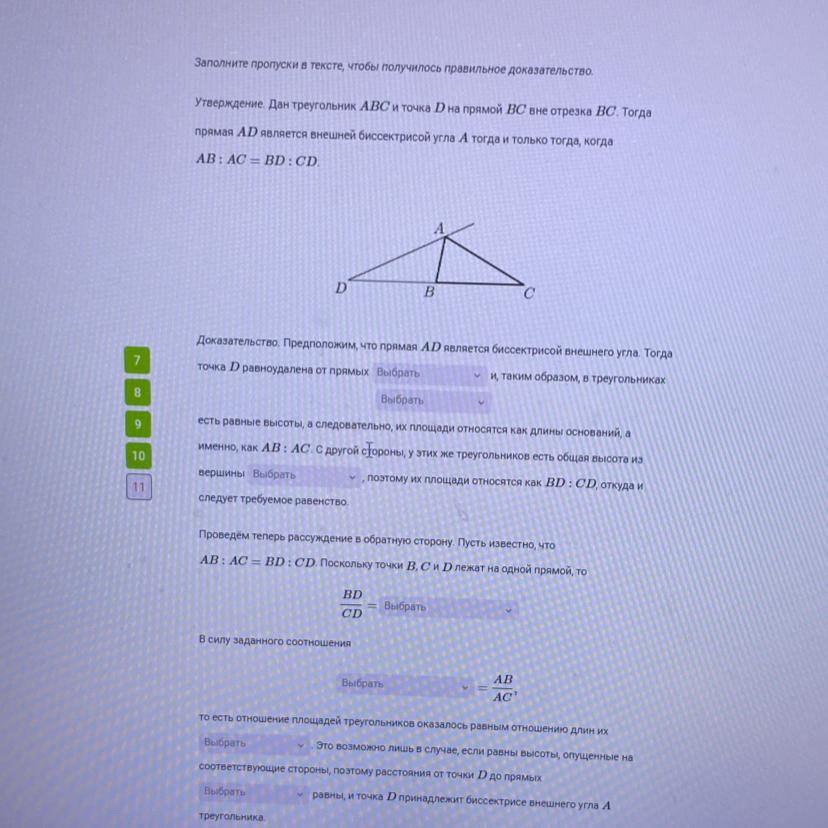 Утверждение: дан треугольник АВС и точка D на прямой ВС вне отрезка ВС. Прямая AD является внешней биссектрисой угла А тогда и только тогда, когда АВ : АС = BD : CD.