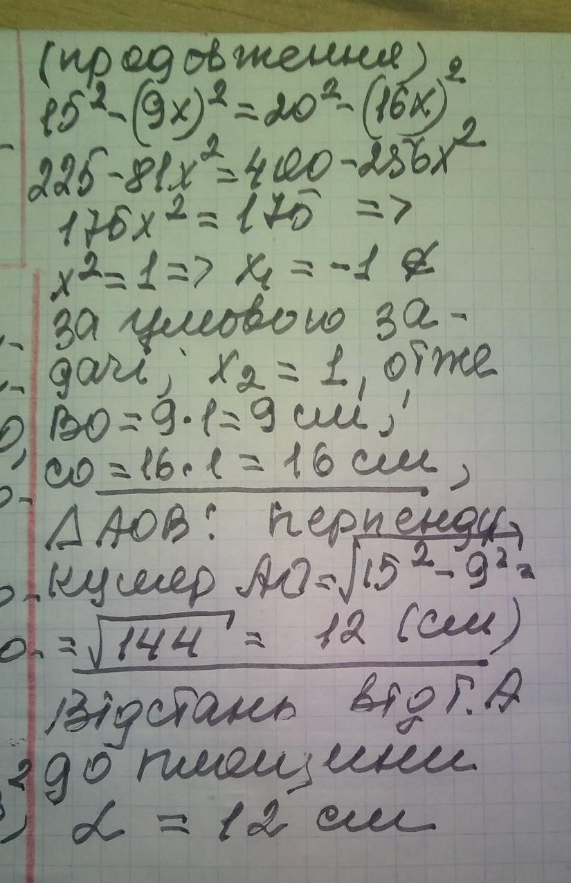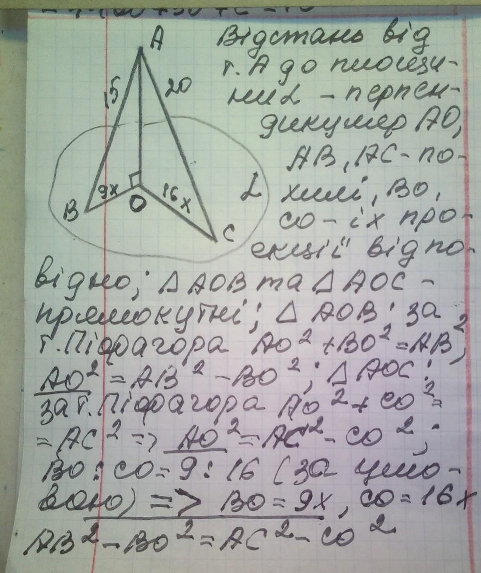 З точки А до площини а проведені похилі АВ і АС, довжини яких 15см і 20см відповідно. Знайдіть відстань від точки А до площини а , якщо проекції похилих на цю площину відносяться як 9:16.