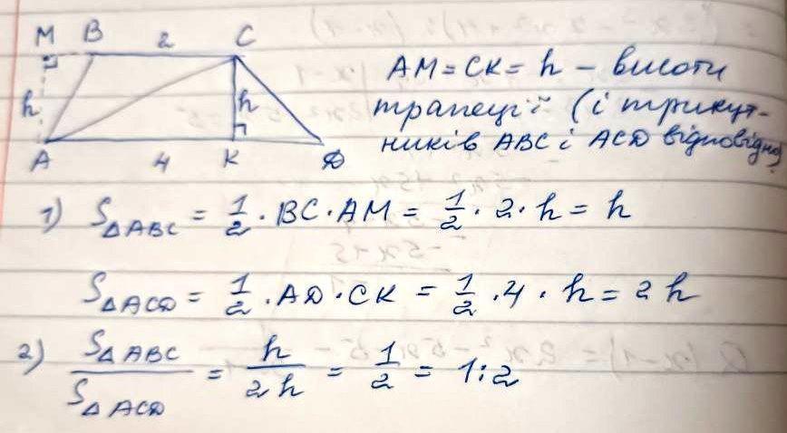 Т.к. отношение сторон этих треугольников (основания трапеции) = 2см/4см, то высоты этих треугольников делятся в таком же соотношении, а их сумма равна 15см, тогда