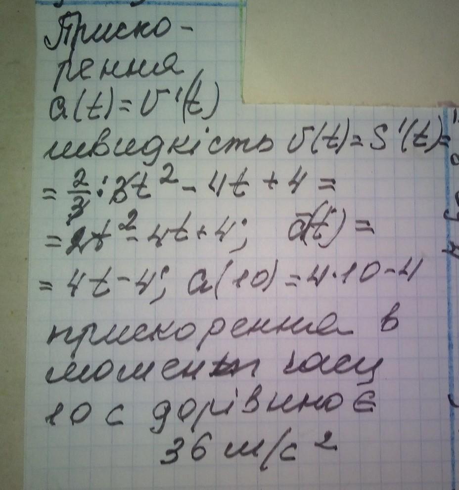 Тіло рухається прямолінійно за законом s(t)=2/3t³--4t²+4t (час t вимірюється в секундах, шлях s--в метрах). Визначте прискорення його руху в момент t=10c