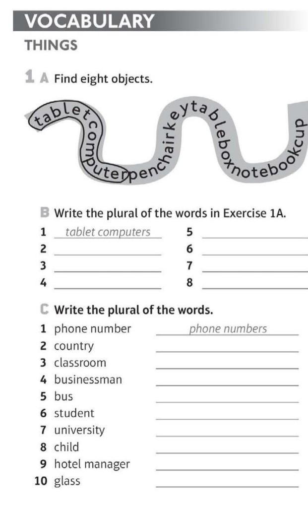 С: phone numbers, countries, classrooms, businessmen, buses, students, universities, children, hotel managers, glasses.