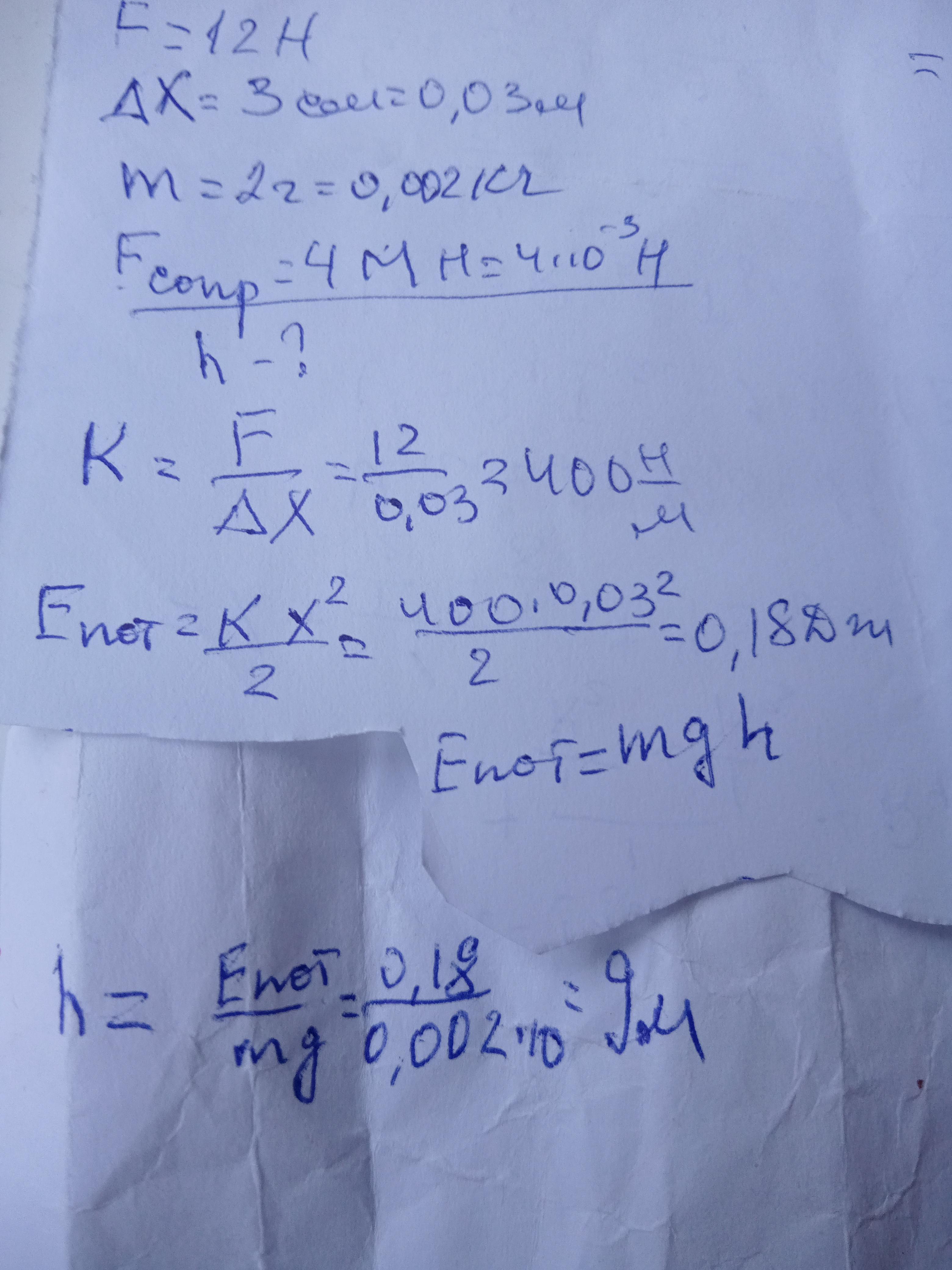 Для подготовки к стрельбе пружину игрушечного пистолета сжимают с силой 12 Н на 3 см. Найдите максимальную высоту подъема пули массой 2 г при вертикальном выстреле? (среднее сопротивление воздуха 4мН, g = 10м/с²