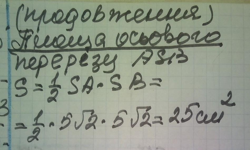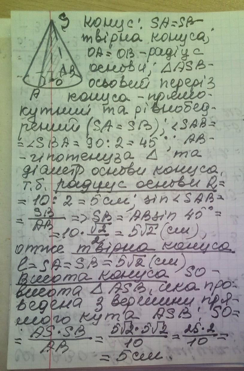 Осьовий переріз конуса - прямокутний трикутник з гіпотенузою 10 см. Знайти: