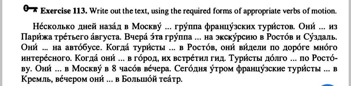 Несколько дней назад в Москву приехала группа французских туристов. Они выехали из Парижа третьего августа. Вчера эта группа поехала на экскурсию в Ростов и Суздаль. Они поехали на автобусе. Когда туристы ехали в Ростов, они видели по дороге много интересного. Когда они приехали в город, их встретил гид. Туристы долго ездили по Ростову. Они уехали в Москву в 8 часов вечера. Сегодня утром французские туристы пошли в Кремль, вечером они пойдут в Большой театр.