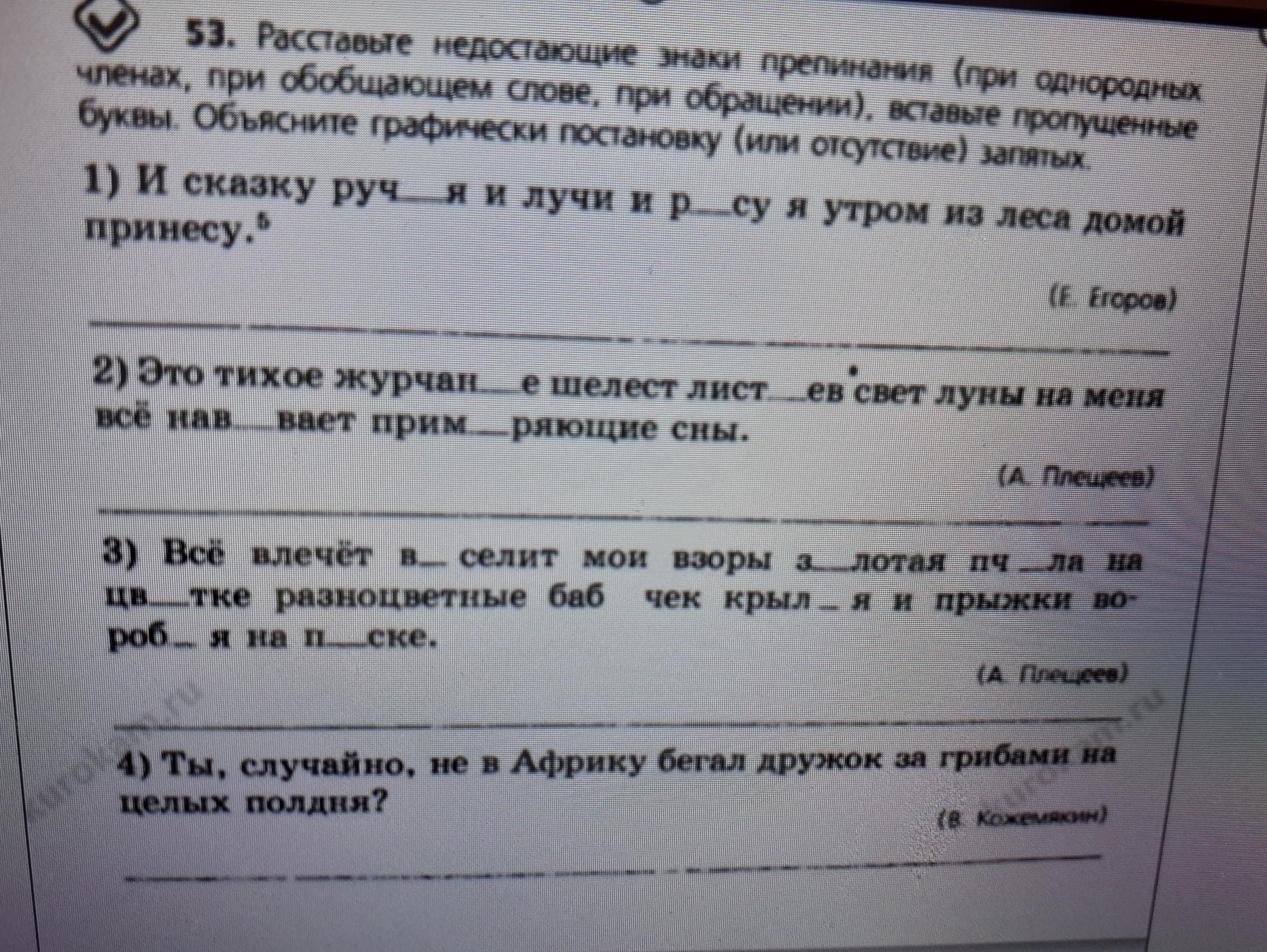 Расставьте недостающие знаки препинания (при однородных членах, при обобщающем слове, при обращении), вставьте пропущенные буквы. Объясните графически постановку или отсутствие запятых.