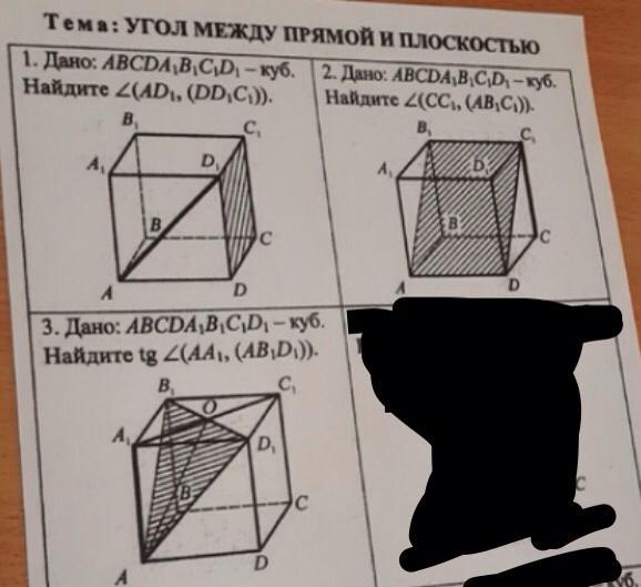 Здравствуйте, сегодня у нас зачет по теме: Угол между прямой и плоскостью, нужно подробное объяснение решения каждого из чертежей. Помогите, пожалуйста!