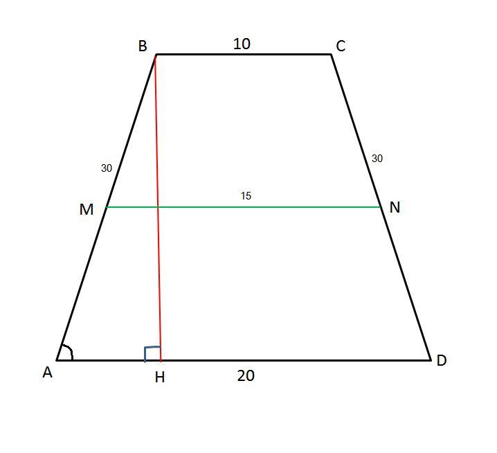Найти площадь равнобедренной трапеции если меньшая основа равна 10см большая 20см, ребра 30см