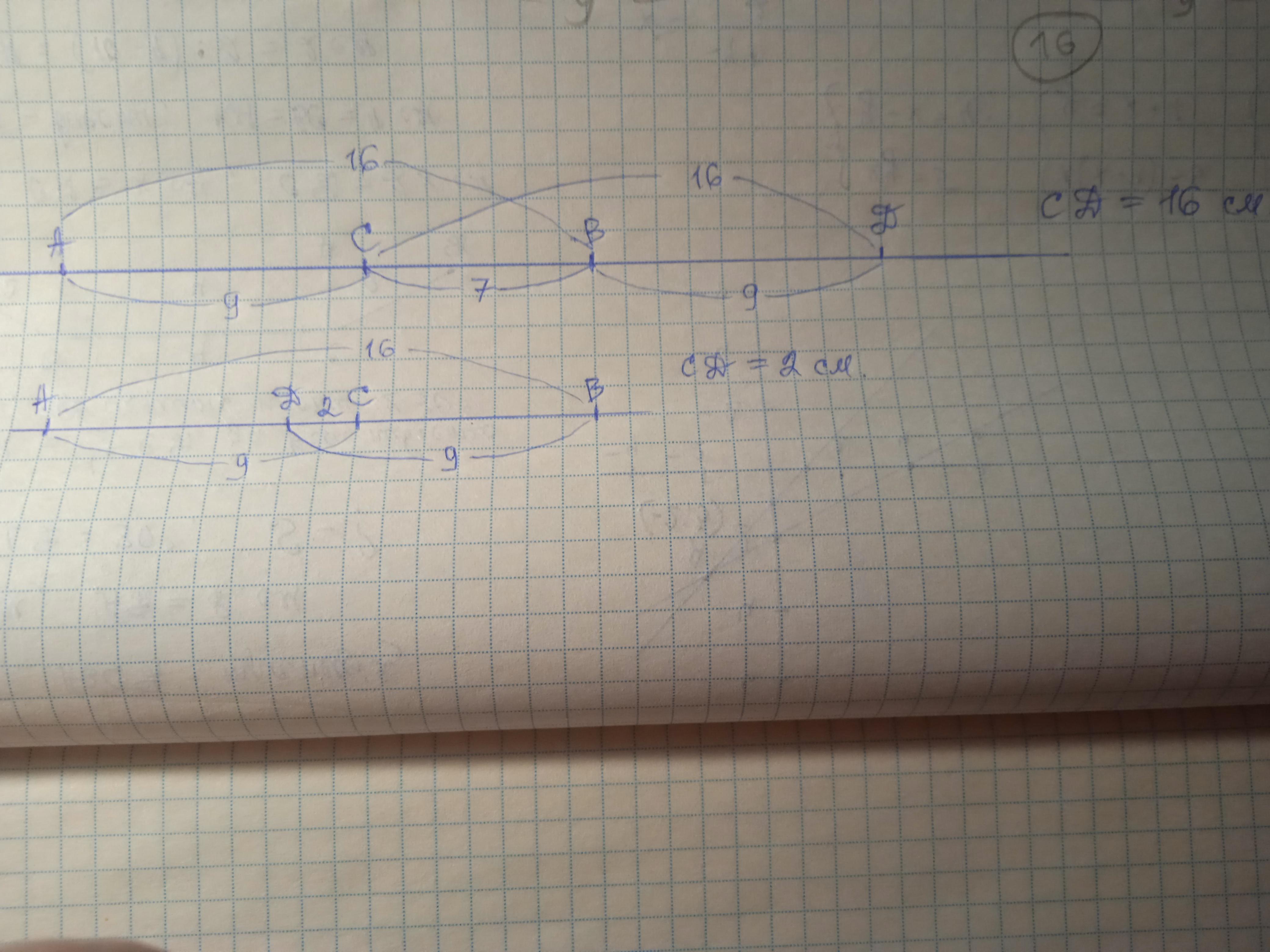 Точки А, В, С та D розташовані на одній прямій, причому АВ=16 см, АС=ВD=9 см. Знайдіть довжину відрізка СD. Скільки розв’язків має задача?