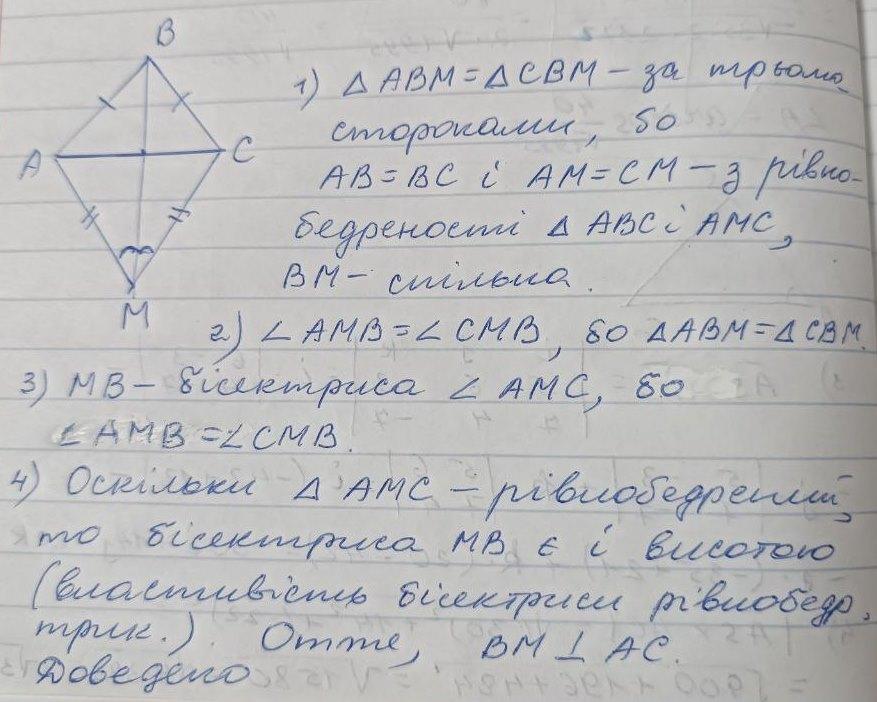 8. На відрізку АС по різні сторони від нього побудовано два рівнобедрених трикутника АВС та АМС. Вершини цих трикутників з’єднані прямою ВМ. Доведіть, що ВМ перпендикулярно АС.