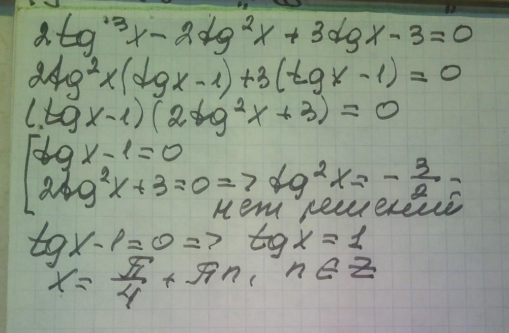 Выберете правильное решение уравнения:\( 2tg³x - 2tg²x + 3tgx - 3 = 0 Выберите один ответ: \( x = 4 + "n, neZ - \(x= \frac{ \pi}{4}+ \pi n, n \epsilon Z \(x= \frac{ \pi}{4}+2 \pi n, n \epsilon Z \( x = 4 +n, neZ
