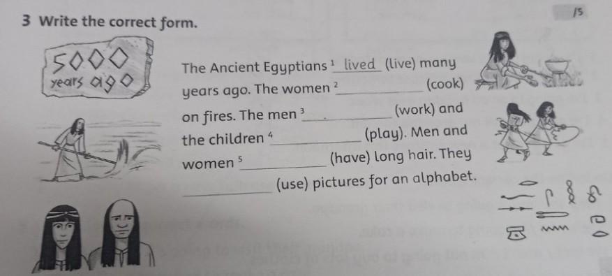 3 Write the correct form. 5000 years ago MA The Ancient Egyptians lived (live) many years ago. The women (cook) on fires. The men ³ the children women (work) and (play). Men and (have) long hair. They (use) pictures for an alphabet. 5 4 14 /5 xxxx el