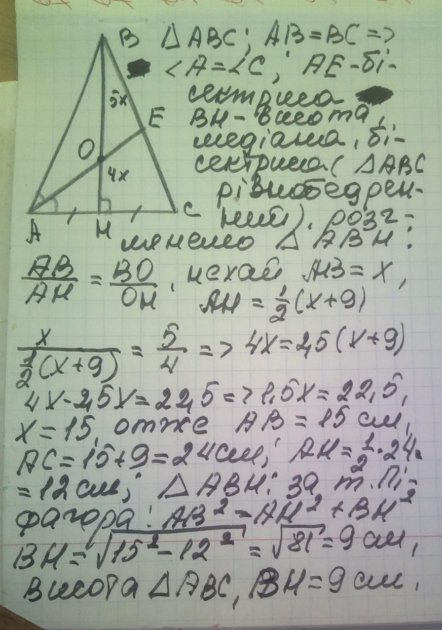 Бiчна сторона рiвнобедреного трикутника менша від основи на 9 см, а вiдрiзки, на які бісектриса кута при основi подiляє висоту, проведену до основи, відносяться як 5:4. Знайдіть висоту трикутника, проведену до основи.