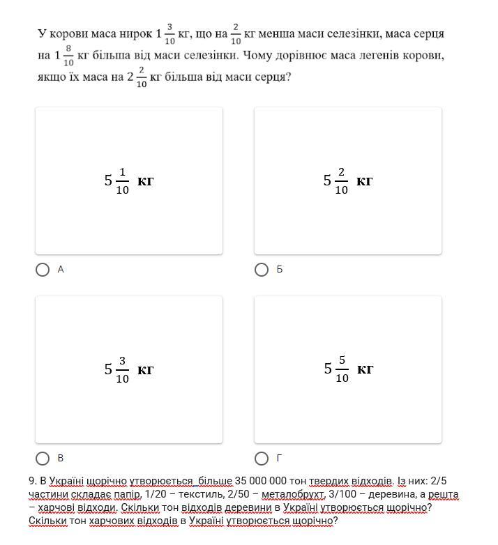 8. Маса селезінки = 1 ціла 3/10+2/10 = 1 ціла 5/10 = 1 ціла 1/2 кг