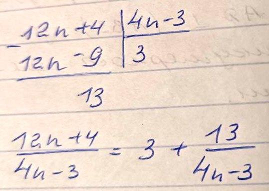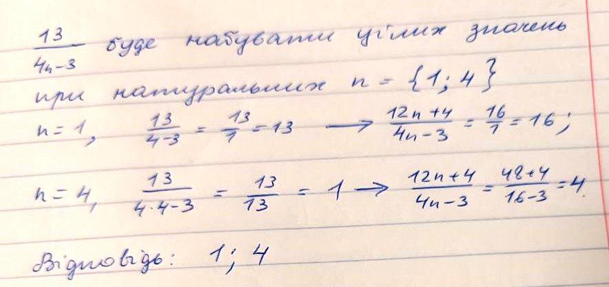 В решении указано, что дробь 13/(4n-3) будет целым числом только тогда, когда 13 будет нацело делиться на знаменатель. Поскольку 13 - простое число, то оно имеет только два делителя: 1 и 13. Т.е знаменатель 4n-3 может быть равен 1 или 13. А это возможно только при n=1 или n=4, что и расписано детально в решении.
