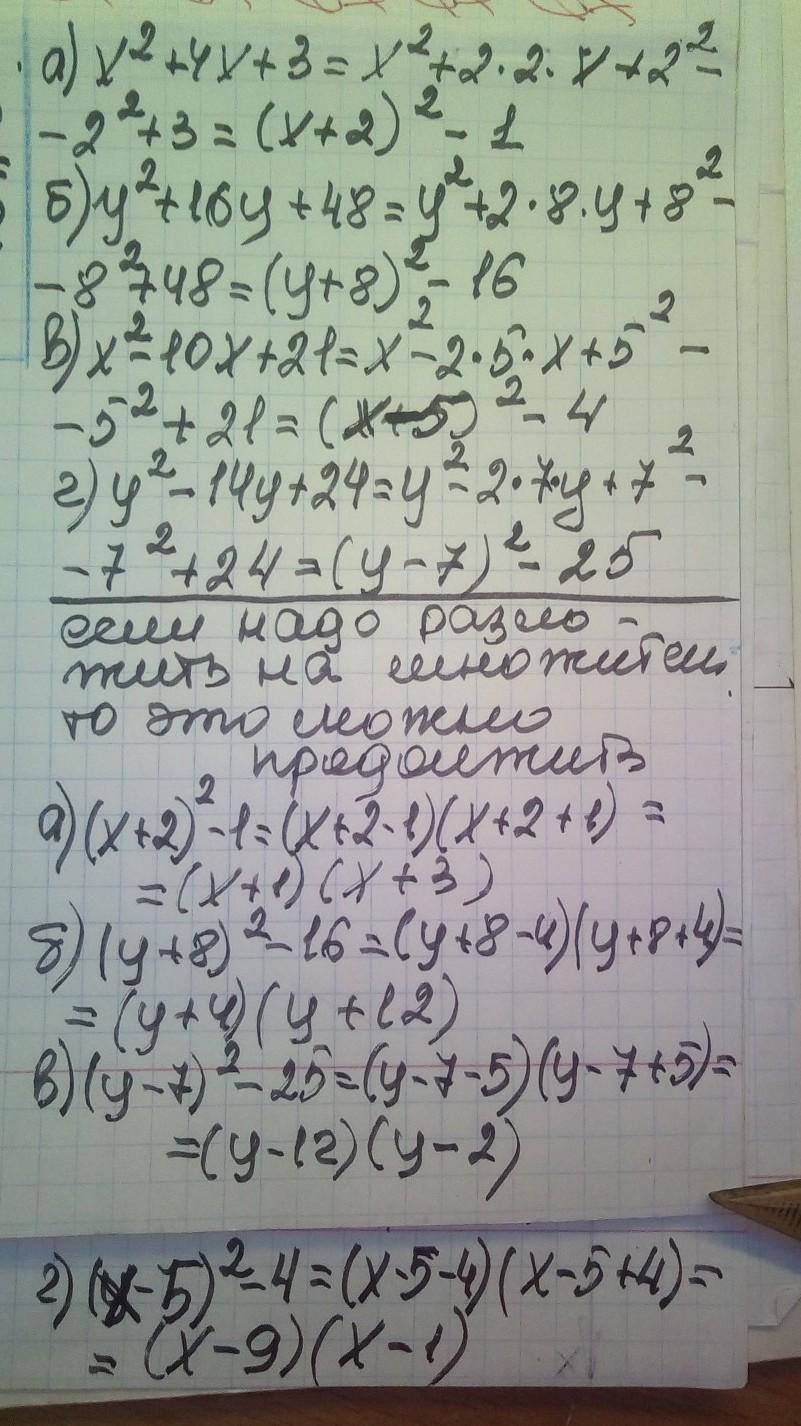 робочому зошиті. 1. Виділи квадрат двочлена. a) x² + 4x + 3; B) y² + 16y + 48; 6) x² - 10x + 21; г) y² - 14y + 24. робочому зошиті . 1. Виділи квадрат двочлена . a ) x² + 4x + 3 ; B ) y² + 16y + 48 ; 6 ) x² - 10x + 21 ; г ) y² - 14y + 24 .