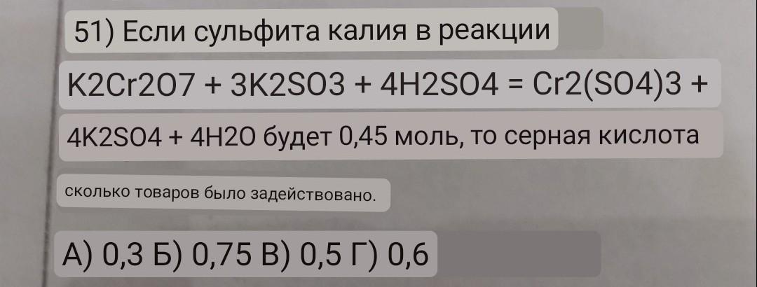 2) из условия количество сульфита калия 0,45 (моль). Значит, количество серной кислоты должно быть 0,45*4/3=0,6 (моль).