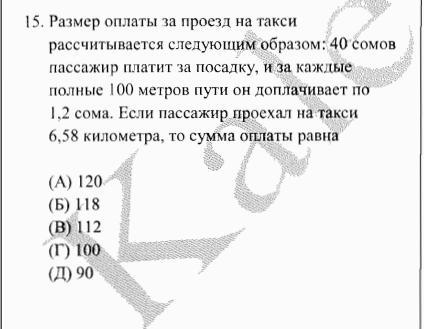 Размер оплаты за проезд на такси рассчитывается следующим образом: 40 сомов пассажир платит за посадку, и за каждые полные 100 метров пути он доплачивает по 1,2 сома. Если пассажир проехал на такси 6.58 километра, то сумма оплаты равна...