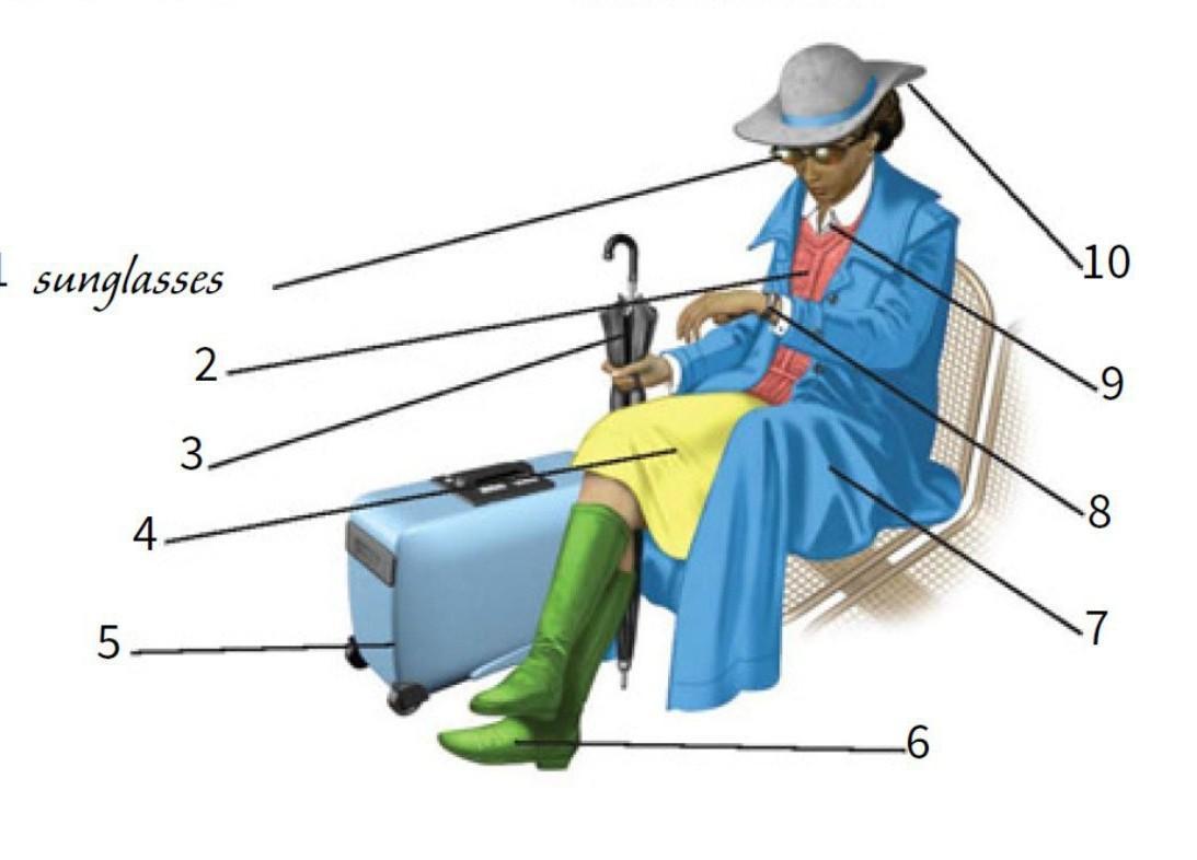 2- vest 3-umbrella 4-skirt 5-suitcase 6-boots 7-cloak 8-watch 9-shirt 10-hat