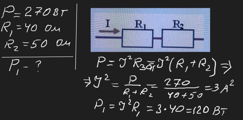 Загальна потужність, яка виділяється під час проходження електричного струму на приведеній ділянцi кола, дорівнює 270 Вт. Знайти потужність на резисторi R1. R1= 40 OM, R2 = 50 Ом.