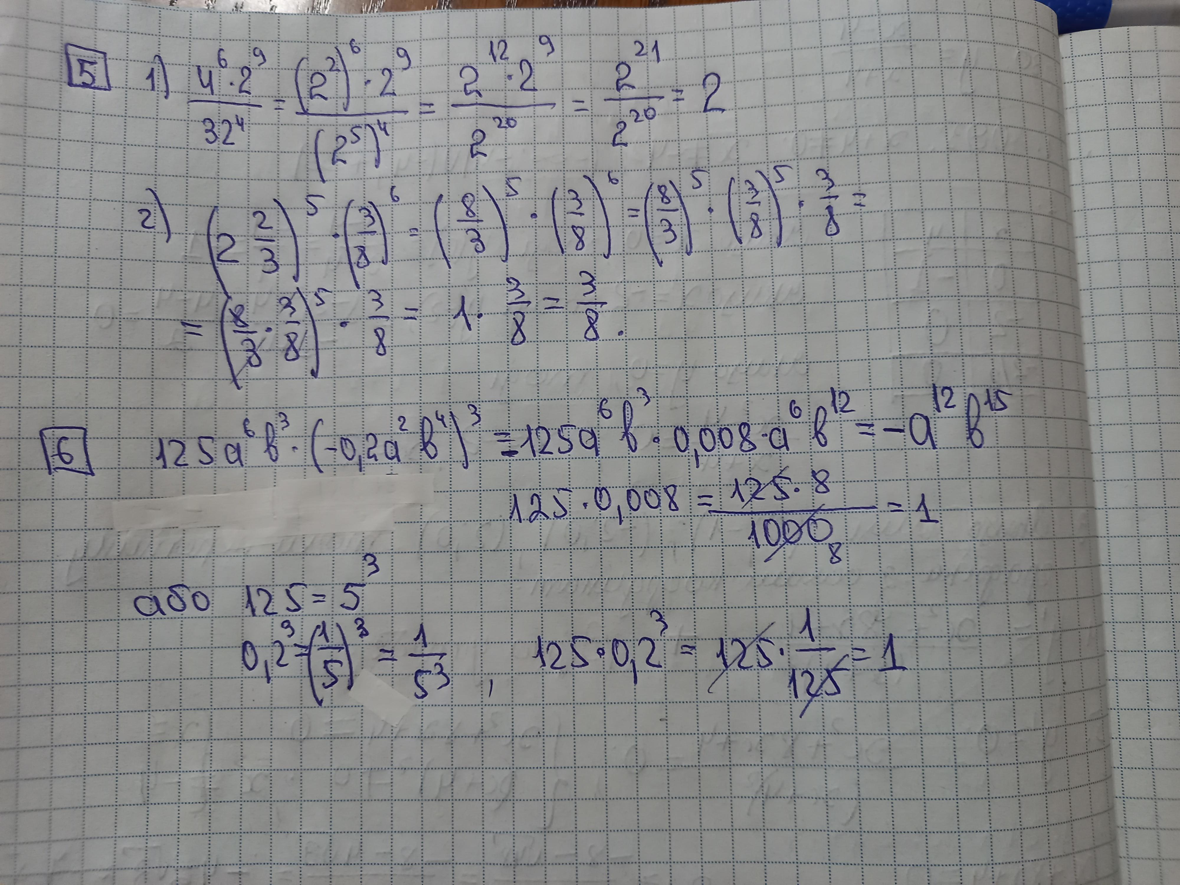 5. 1) 4=2^2; 32=2^5, тому вираз=2^(2*6+9-5*4)=2^1=2; 2) 2 2/3=8^3; 8=2^3, тому вираз=2^(3*5-3*6)*3^(6-5)=2^(-3)*3^1=3/8; 6. 125=5^3; 0.2=1/5=5^(-1), тому вираз=-5^(3+(-1)*3)*a^(6+2*3)*b^(3+4*3) = -5^0*a^12*b^15=-a^12*b^15, можна далі =-(a^4*b^5)^3=-b^3*(a*b)^12.....