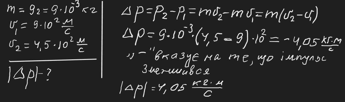 Куля масою 9 г пробила стіну і внаслідок цього швидкість її зменшилася 900 м/с до 450 м/с. Визначте, на скільки зменшився імпульс кулi.