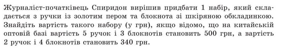 Журналіст - початківець Спиридон вирішив придбати 1 набір , який скла дається з ручки із золотим пером та блокнота зі шкіряною обкладинкою . Знайдіть вартість такого набору ( у грн ) , якщо відомо , що на китайській оптовій базі вартість 5 ручок і 3 блокнотів становить 500 грн , а вартість 2 ручок і 4 блокнотів становить 340 грн .
