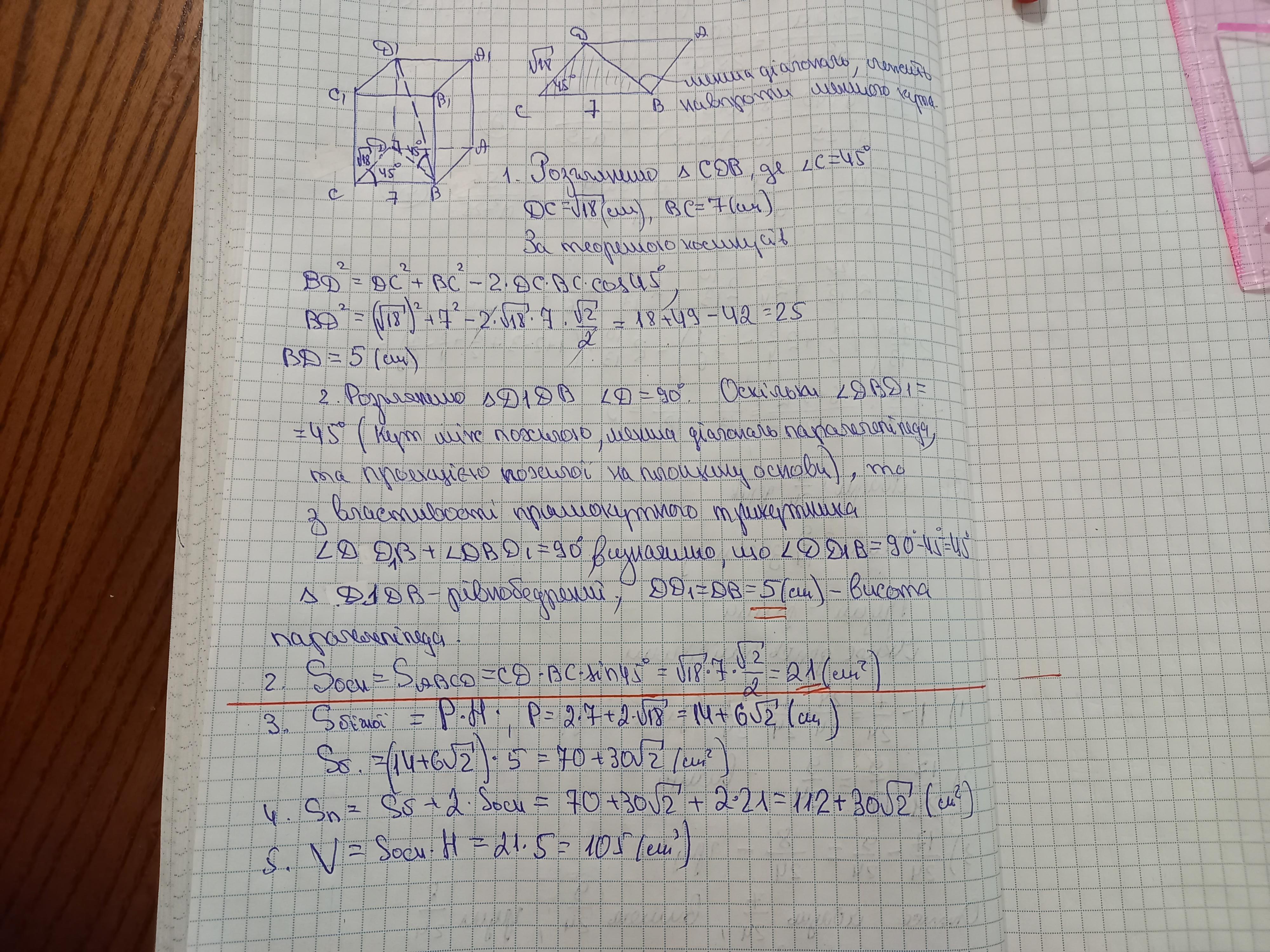 Сторони основи прямого паралелепіпеда дорівнюють 7см і √18 і устворюють кут 45º, а менша діагональ - кут 45º з площиною основи.