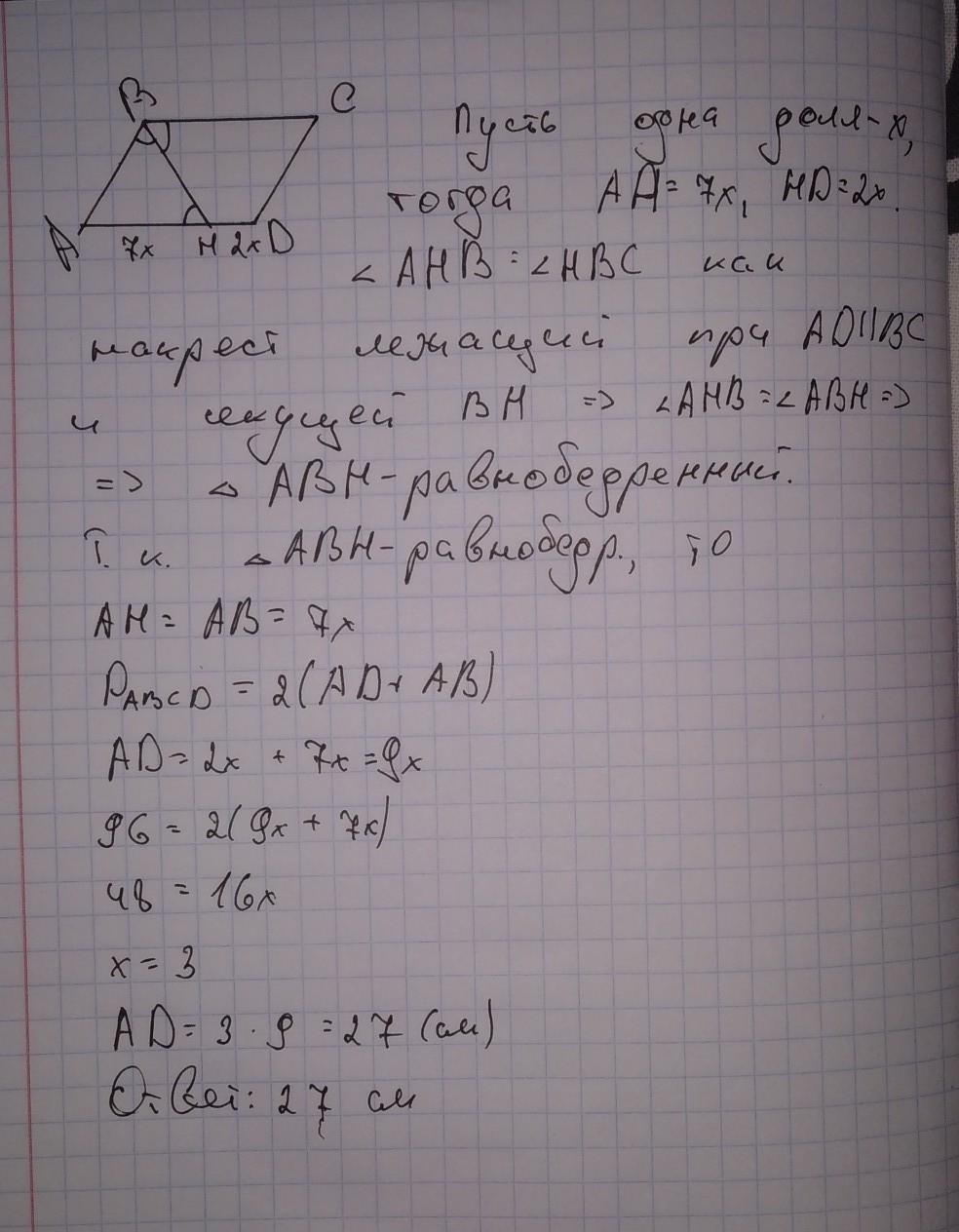 биссектриса тупого угла параллелограмма делит противоположную сторону в отношении 7 : 2, считая от вершины острого угла найдите большую сторону параллелограмма, если его периметр равен 96