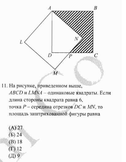 На рисунке, приведенном выше, ABCD и LMNA - одинаковые квадраты. Если длина стороны квадрата равна 6, точка Р- середина отрезков DC и MN, то площадь заштрихованной фигуры равна