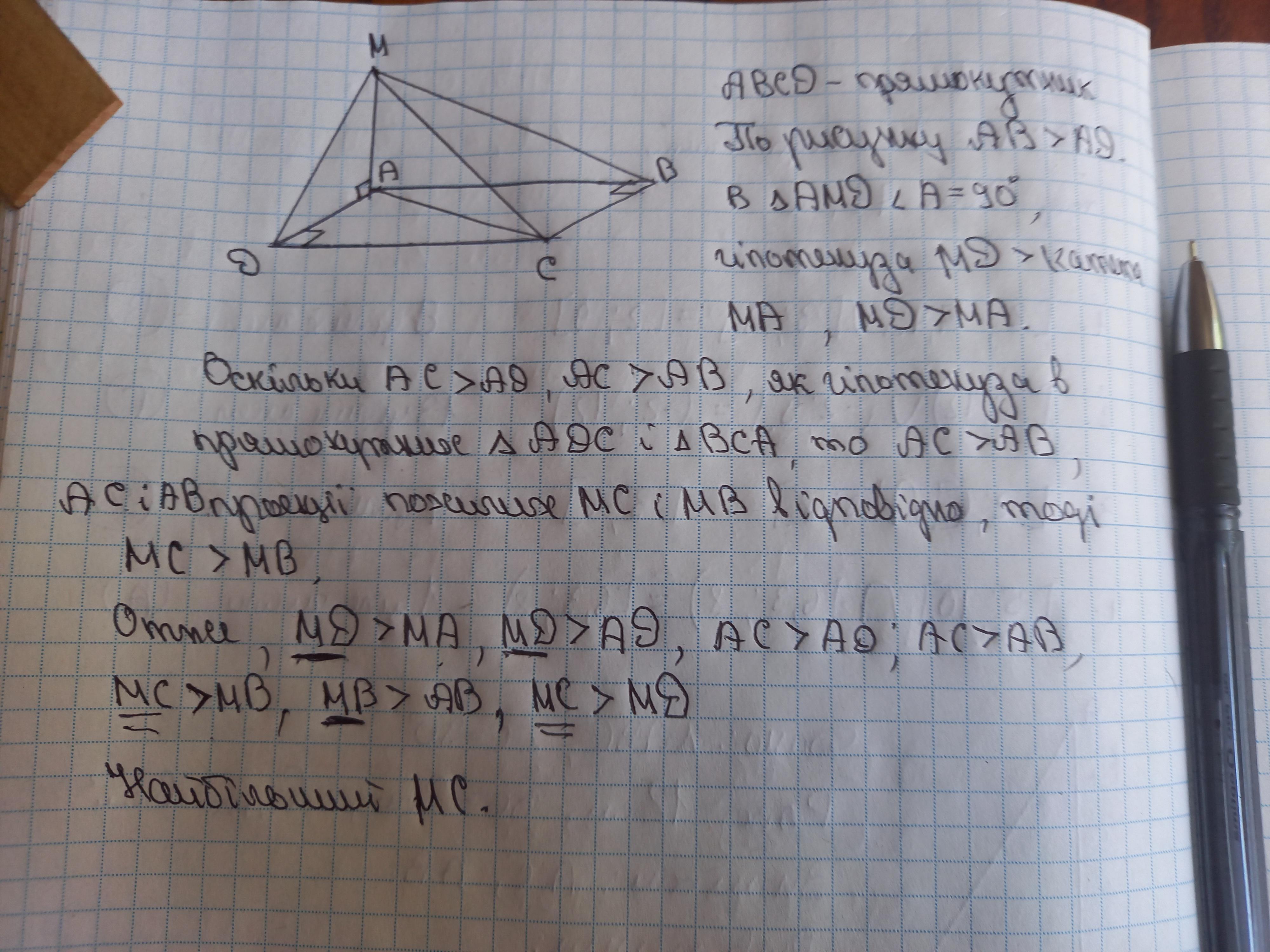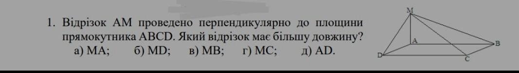 На українській: Відрізок АМ проведено перпендикулярно до площини прямокутника АВСD. Який відрізок має більшу довжину?
