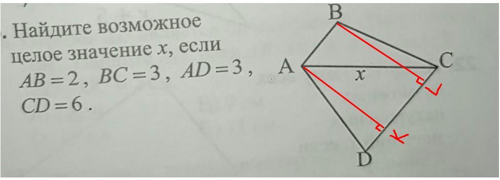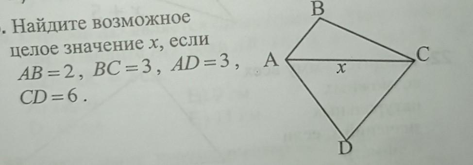 Есть два треугольника с общей стороной. По свойству треугольника (сумма двух сторон меньше третьей) можно составить систему из шести неравенств (по три для каждого треугольника). Решив её, мы найдём диапазон значений икс: