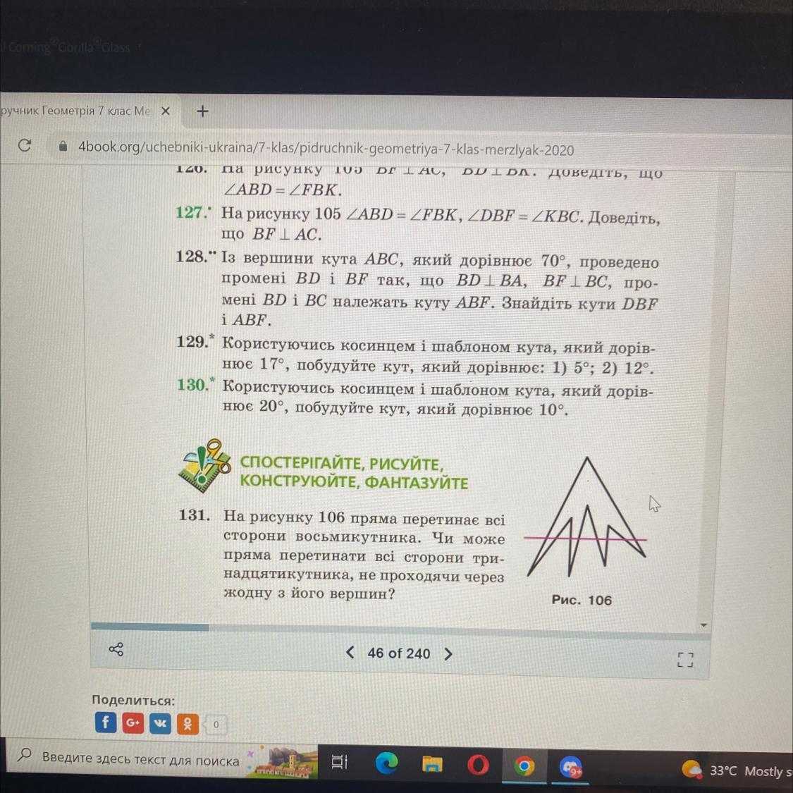 В 130, я думаю, надо использовать вписанный угол. Хотя все равно есть вопрос про линейку. Скажем, если я получил дугу в 10° на какой-то окружности, это считается, что я построил угол?