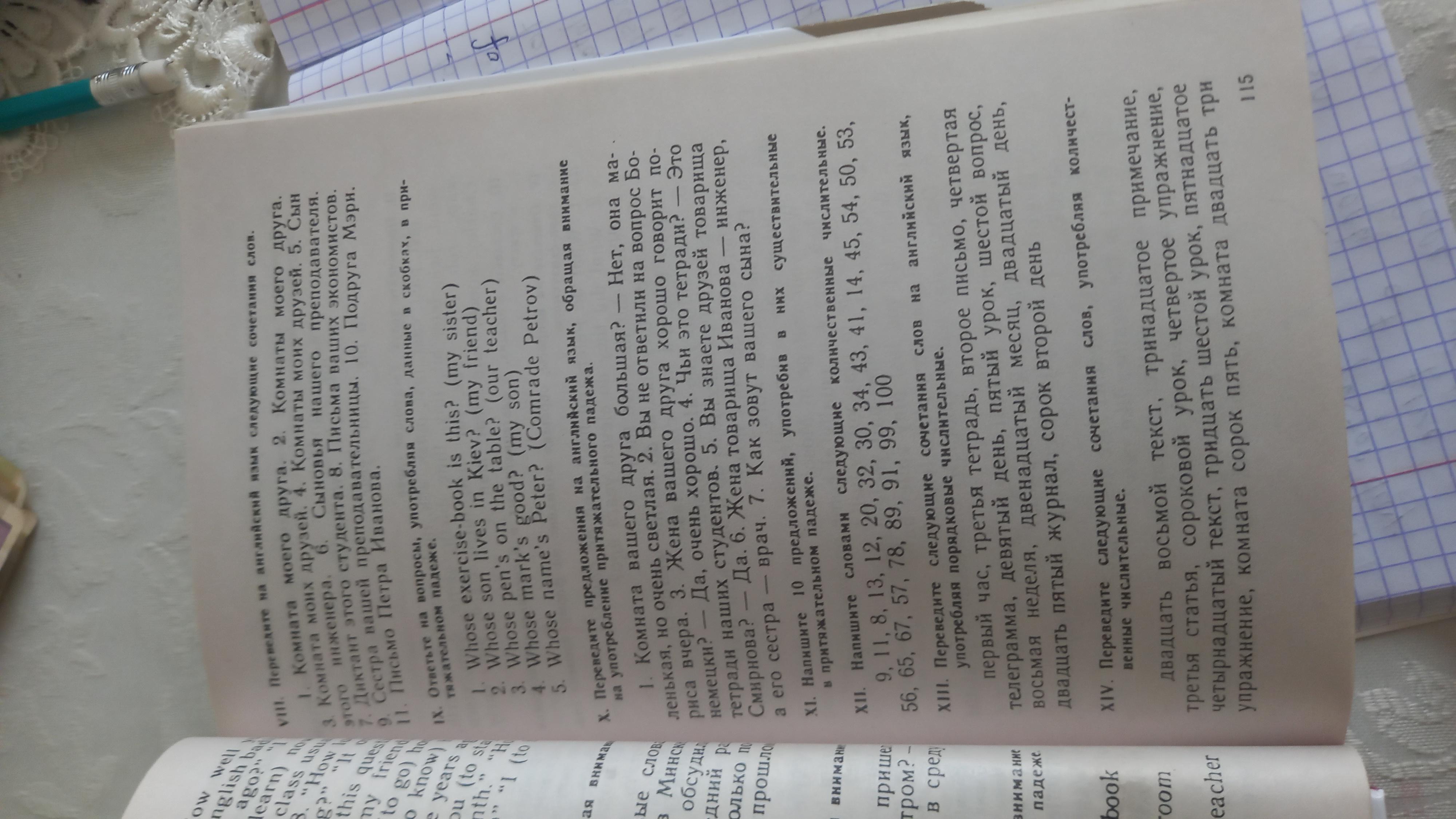 - Is your friend's room is big?--No,it is small but very bright.You didn't answer question of Boris yesterday.Is your friend's wife speaks in german very well?--Yes,very good.Whose that exercise-book is?--It's our student's exercise-books. Do you know friends of Comrade Smirnov?--Yes,I do.Comrade Ivanov's wife is an engineer and his sister is a doctor.What is the name of your son?