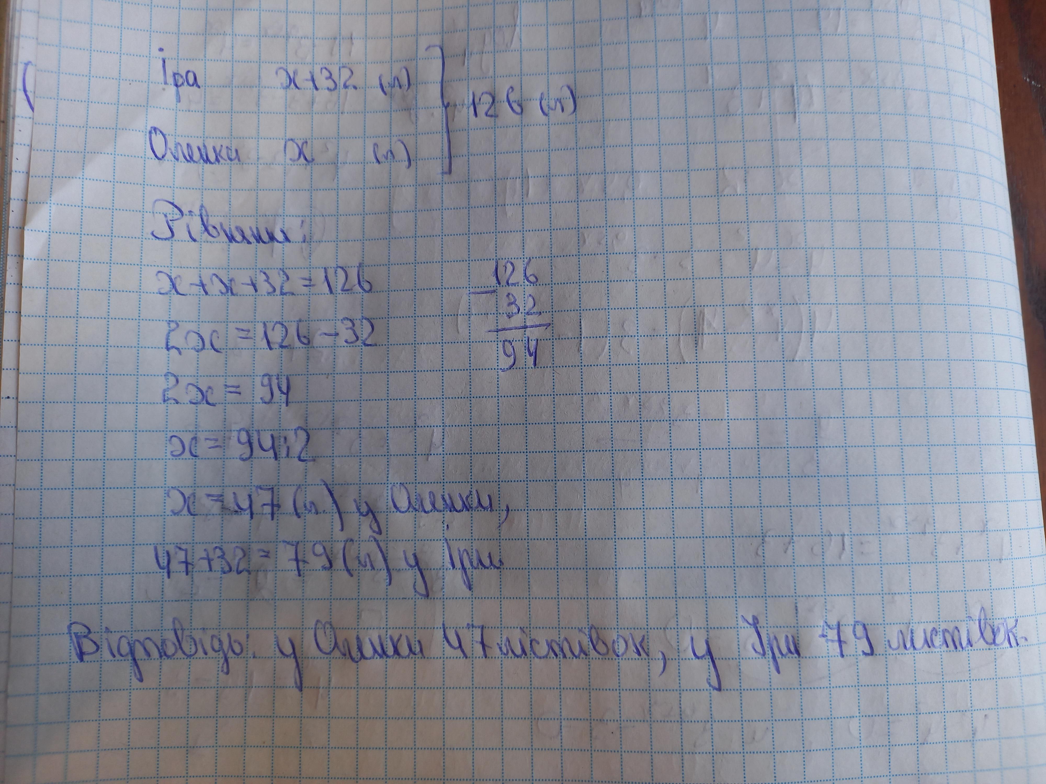 У Іри та оленки разом 126 листівок, причому у Іри на 32 листівки більше, ніж у Оленки. Скільки листівок у кожної дівчинки?????