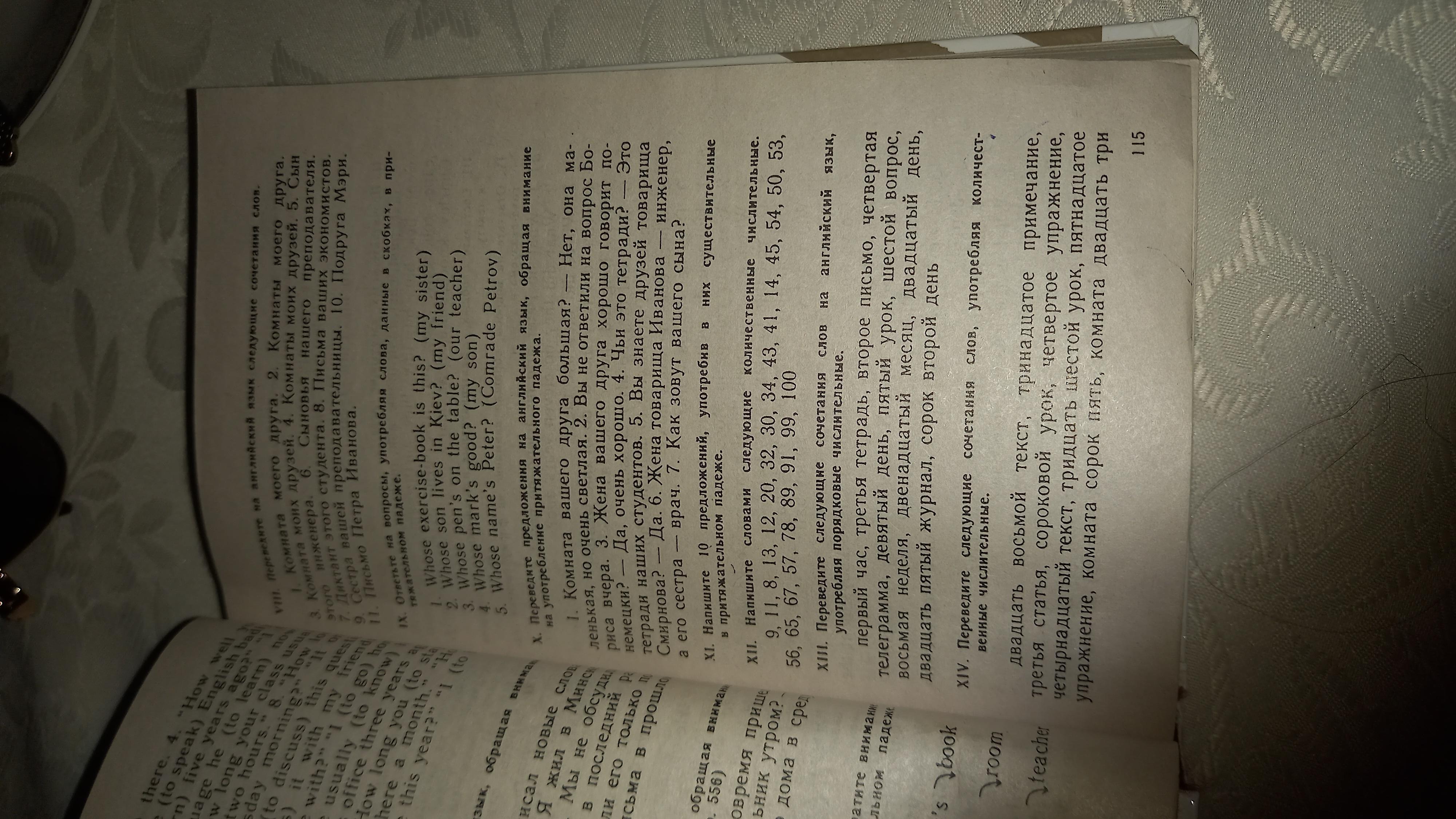 10.1. Is your friend's room large? No, it is little, but it is light. 2. You didn't answer Boris' question yesterday. 3. Does your friend's wife speak German well? Yes, very well. 4. Whose exercise books are these? These are our students' exercise-books. 5. Do you know comrade Smirnov's friends? Yes, I do. 6. Comrade Ivanov's wife is an engineer, and his sister is a doctor.7. What is your son's name?