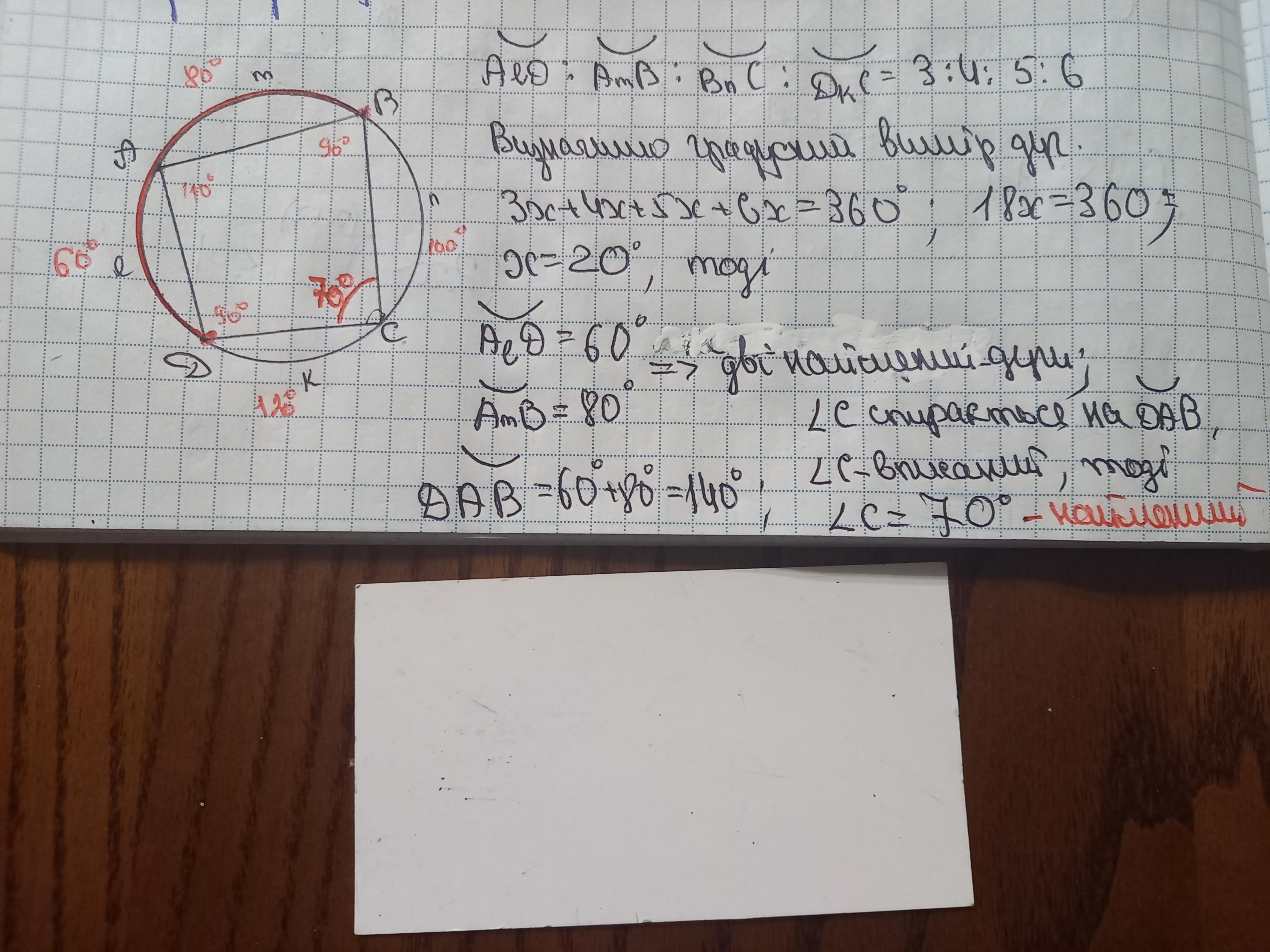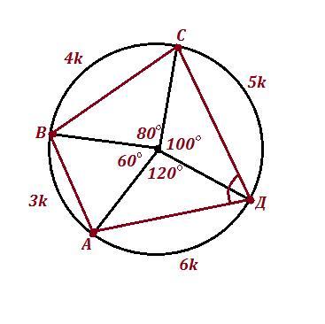 Тогда градусные меры дуг равны дуга АВ=3*20=60° , дуга ВС=4*20=80° , дуга СД=5*30=100° , дуга ДА=6*20=120° .