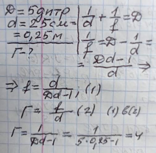 яке збільшення дає збірна лінза з оптичною силою 5дптр, якщо предмет розшташований на відстані 25см від лінзи
