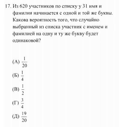 Из 620 участников по списку у 31 имя и фамилия начинается с одной и той же буквы. Какова вероятность того, что случайно выбранный из списка участник с именем и фамилией на одну и ту же букву будет одинаковой?