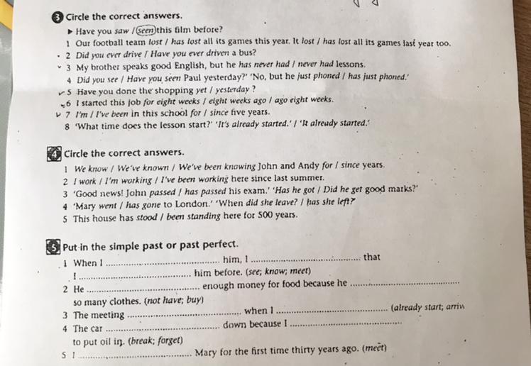 1. has lost; lost. 2.Have you ever driven a bus? 3. ...but he has never had lessons. 4. Did you see Paul yesterday? No, but he has just phoned. 5. Have you done the shopping yet? 6. I started this job right weeks ago. 7. I've been in this school for five years. What time does the lesson start? It's already started.