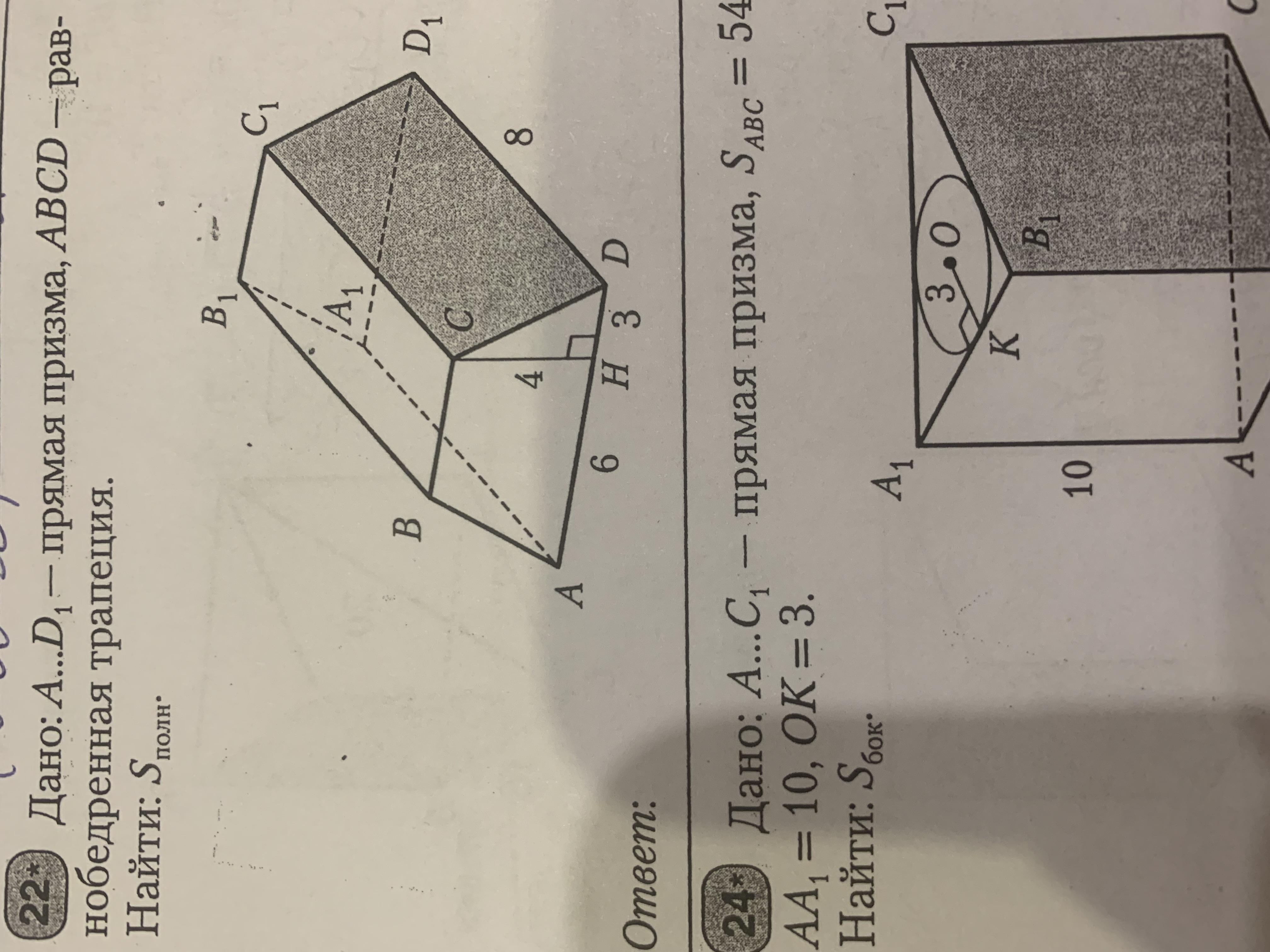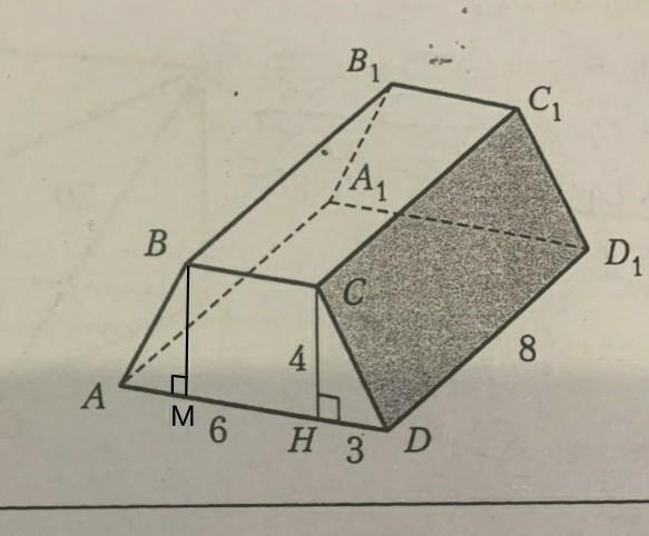 Дано: А...Д1 - прямая призма, АВСД - равнобедренная трапеция, АН=6, НД=3, СН=4, ДД1=8. Найти: Sполн