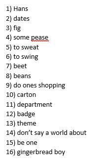 1. Ганс 2. побачення 3. інжир 4. трохи гороху 5. потіти 6. гойдатися 7. буряк 8. квасоля 9. робити покупки 10. коробка 11. відділення 12. значок 13. тема 14. не кажи ні слова про 15. будь один 16. пряниковий хлопчик