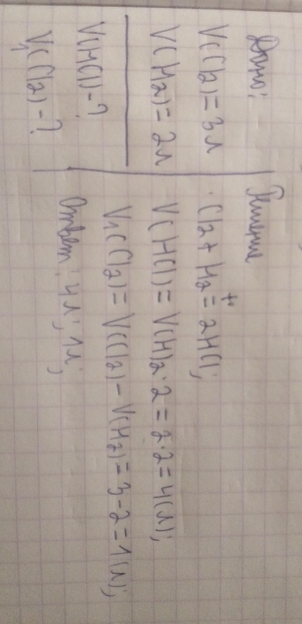 Змішали хлор об'ємом 3 а і водень об'емом 2 л. Суміш підірвали. Які гази 1 в якому об'емi залишилися після реакції?)