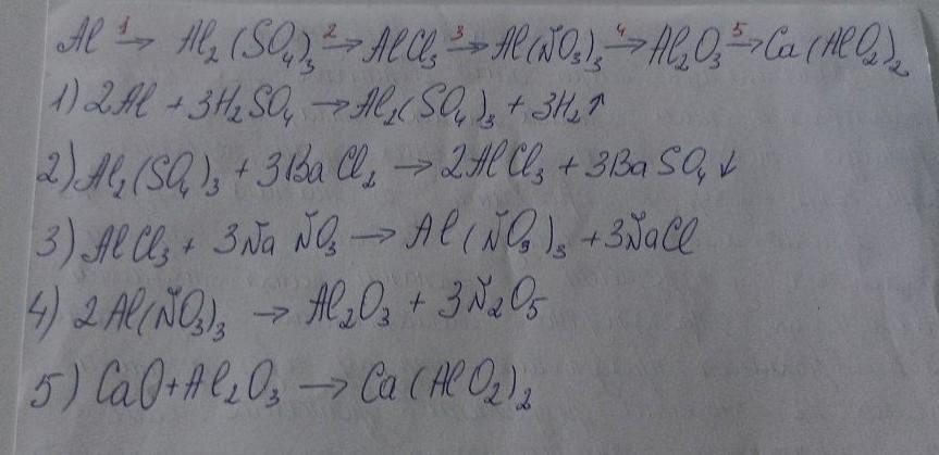 Напишіть рівняння реакцій, за допомогою яких можна здійснити такі перетворення: Al → Al2(SO4)3 → AlCl3 → Al(NO3)3 → Al2O3 → Ca(AlO2)2 .
