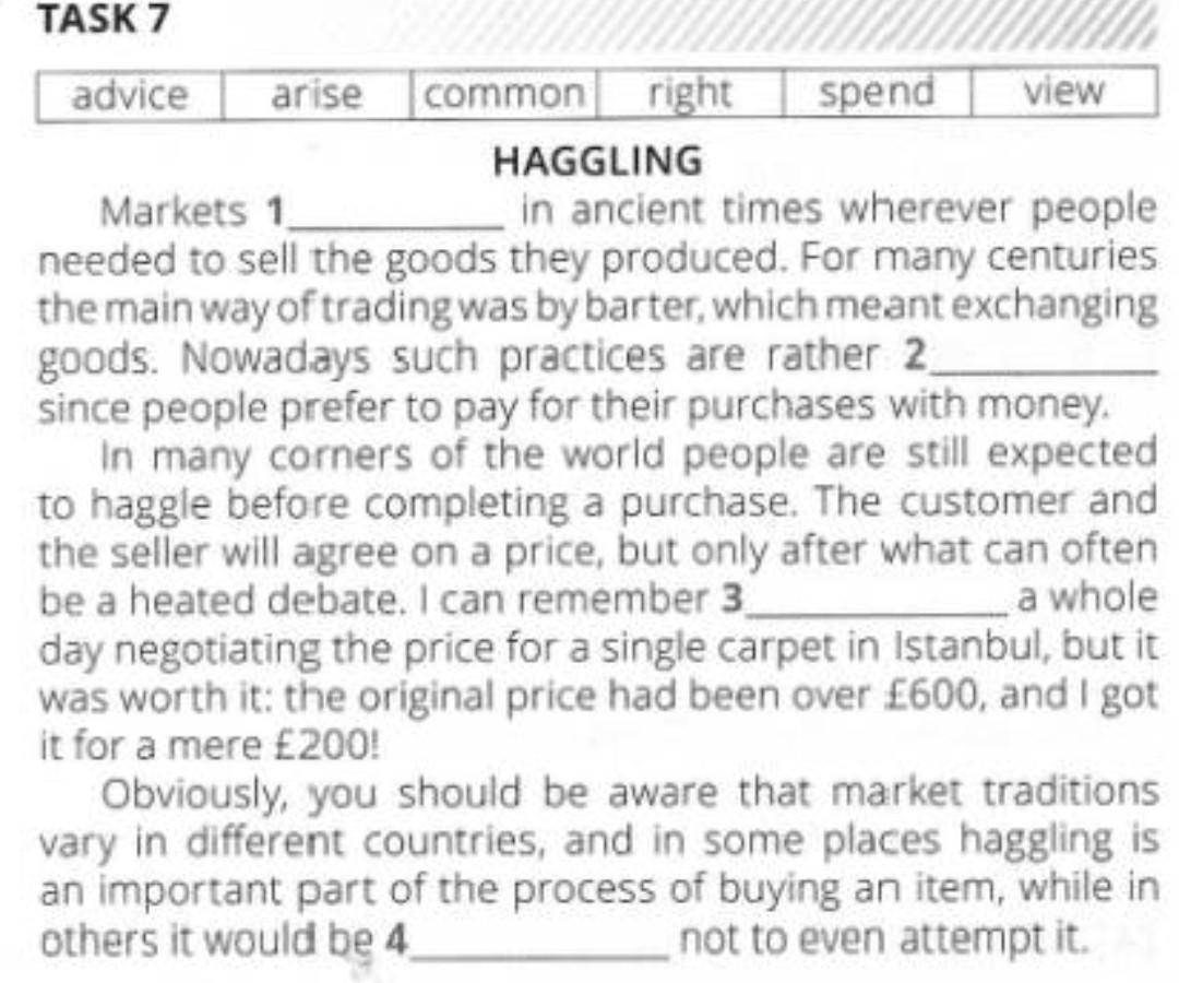 Markets ___ in ancient times wherever people needed to sell the goods they produced. For many centuries. the main way of trading was by barter, which meant exchanging goods. Nowadays such practices are rather ____, since people prefer to pay for their purchases with money. In many corners of the world people are still expected to haggle before completing a purchase. The customer and the seller will agree on a price, but only after what can often be a heated debate. I can remember ___ a whole day negotiating the price for a single carpet in Istanbul, but it was worth it: the original price had been over £600, and I got it for a mere £200! Obviously, you should be aware that market traditions. vary in different countries, and in some places haggling is an important part of the process of buying an item, while in others it would be ___. not to even attempt it.