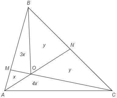 в треугольнике ABC на стороне BC взята точка M, а на стороне BC- точка N, так, что AM:MB=1:3, BN:NC = 1:1. Отрезки AN и CM пересекаются в точке o, найдите площадь CON, если площадь AOM = 1