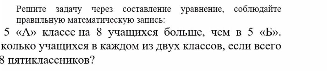 Пусть в 5Б классе х учащихся, тогда в 5А классе х+8 учащихся, известно, что всего в двух классах 58 учащихся. Имеем уравнение: