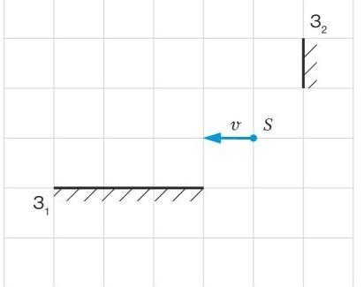 Два взаимно перпендикулярных зеркала З1 и З2 расположены так, как показано на рисунке. Ширина одной клеточки 1 м. Точечный источник S движется параллельно зеркалу З1 со скоростью v=1 м/мин. На рисунке показано положение источника в момент времени t=0.