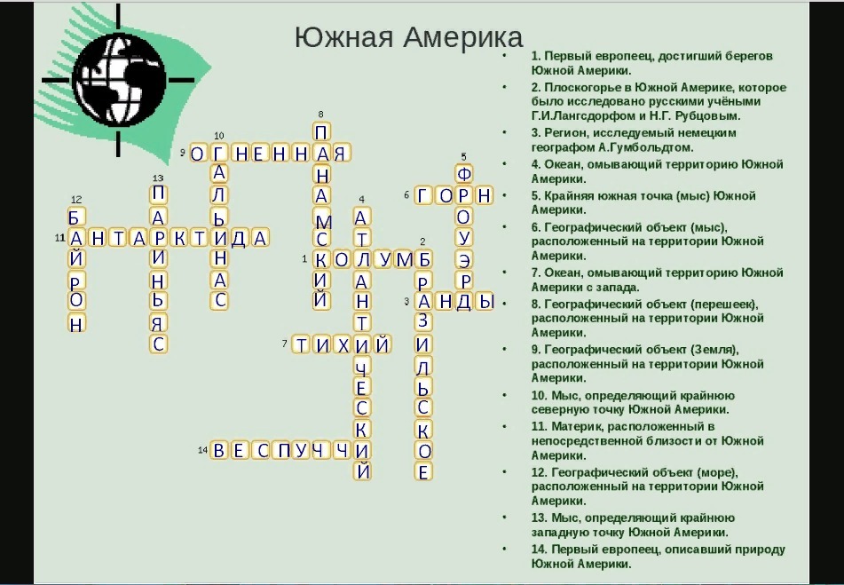 1. Первый европеец, достигший берегов Южной Америки. 2. Плоскогорье в Южной Америке, которое было исследовано русскими учёными Г.И.Лангсдорфом и Н.Г. Рубцовым. 3. Регион, исследуемый немецким географом А.Гумбольдтом. 4. Океан, омывающий территорию Южной Америки. 5. Крайняя южная точка (мыс) Южной Америки. 6. Географический объект (мыс), расположенный на территории Южной Америки. 7. Океан, омывающий территорию Южной Америки с запада. 8. Географический объект (перешеек), расположенный на территории Южной Америки. 9. Географический объект (Земля), расположенный на территории Южной Америки. 10. Мыс, определяющий крайнюю северную точку Южной Америки. 11. Материк, расположенный в непосредственной близости от Южной Америки. 12. Географический объект (море), расположенный на территории Южной Америки. 13. Мыс, определяющий крайнюю западную точку Южной Америки. 14. Первый европеец, описавший природу Южной Америки.